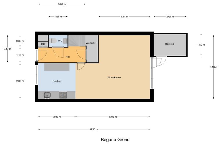 Begane grond: entree; hal met meterkast, toilet met fonteintje, trapopgang, trapkast en toegang tot de woonkamer; keuken aan de voorzijde, voorzien van spoelbak met Quooker en zeeppompje, vaatwasser, combimagnetron, inductiekookplaat en koel-vriescombinatie; lichte woonkamer met fijne zithoek en toegang tot de achtertuin; zonnige achtertuin op het zuidoosten met achterom, berging en tuinhuisje.