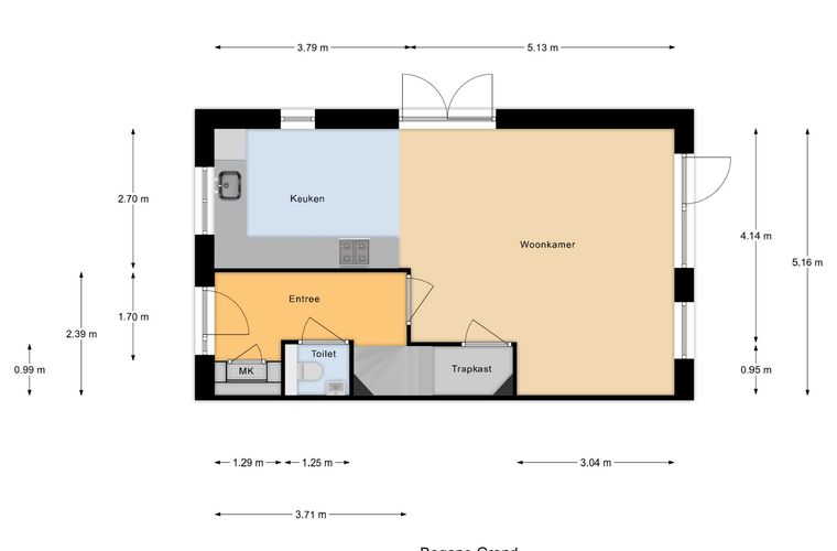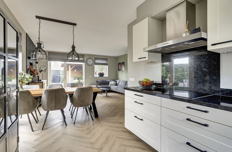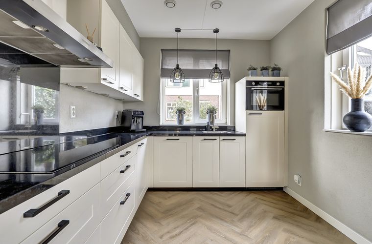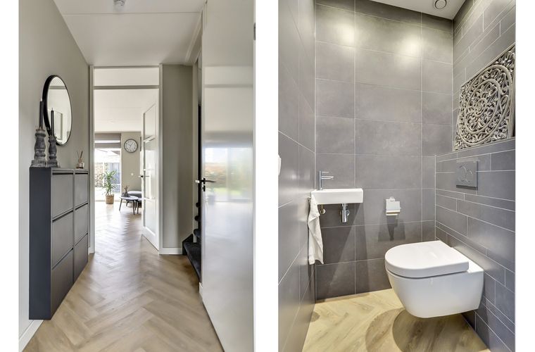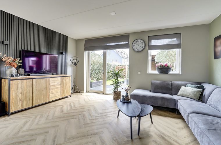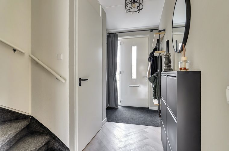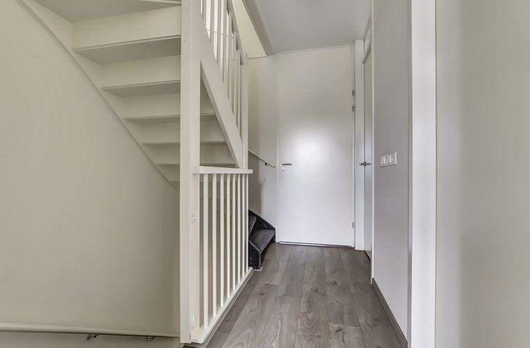 Begane grond: Entree, hal met meterkast, toilet en trapopgang. Ruime woonkamer met visgraat pvc-vloer en vloerverwarming. Open keuken met inductiekookplaat, koelkast, vaatwasser en combi-oven. Zowel via de openslaande deuren als via de deur aan de achterzijde bereik je de tuin.